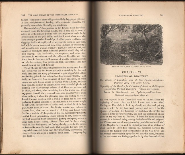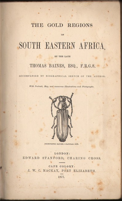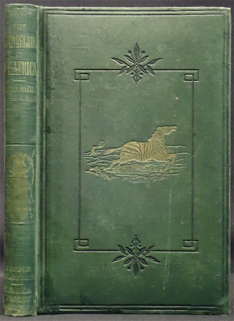 240 pages (including 51 pages of commercial advertisements), frontispiece portrait - a laid down photograph of Baines, title page vignette, large folding map in pocket in back cover, 3 plates, folding facsimile letter, engraved illustrations in the text, original pictorial dark green cloth with a gilt vignette of a galloping zebra on the upper cover, neatly recased – the cloth is dull and lightly stained, some light foxing throughout.