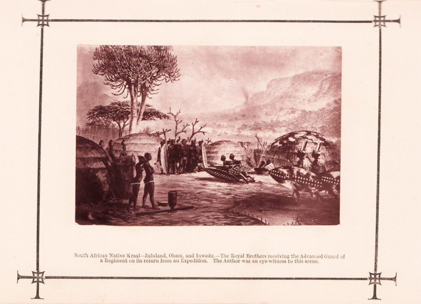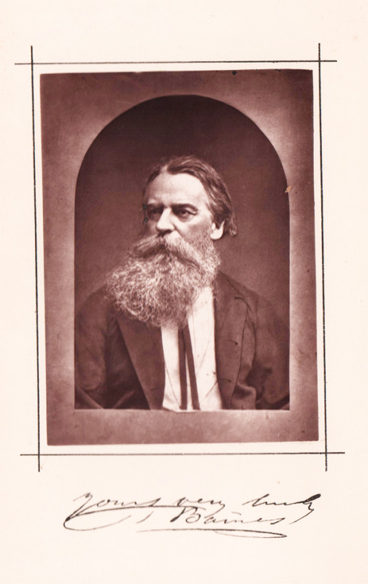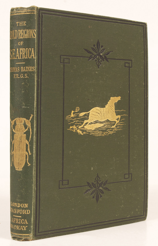 First edition: 240 pages (including 51 pages of commercial advertisements at the end), frontispiece portrait - a laid down photograph of Baines, title page vignette, large folding map in pocket in back cover, 3 plates, folding facsimile letter, engraved illustrations in the text, lines drawn in the margins on several pages of text, original pictorial green cloth with a gilt vignette of a galloping zebra on the upper cover, the boards are slightly worn, uncut edges, a good copy.