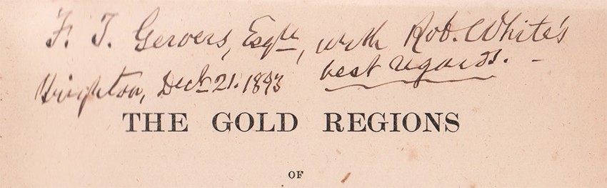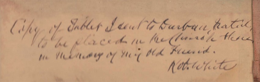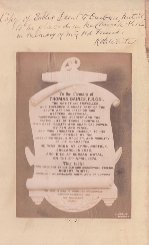 This volume belonged to Robert White, a very good friend of Thomas Baines. On the front paste down end paper is photograph of the marble tablet which White made to commemorate his friend with a handwritten inscription by him which reads: Copy of Tablet I sent to Durban, Natal, to be placed in the Church there in memory of my old friend Rob. White.