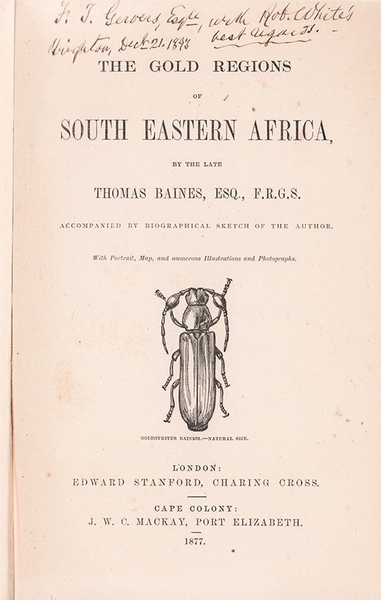 Frank Bradlow's article published in Africana Notes and News December 1978: Robert White, Thomas Baines and the Gold regions of South Eastern Africa is also included in the volume as well as an article from the Cape Monthly Magazine November 1875: Mr Baines' book on the Gold Country.