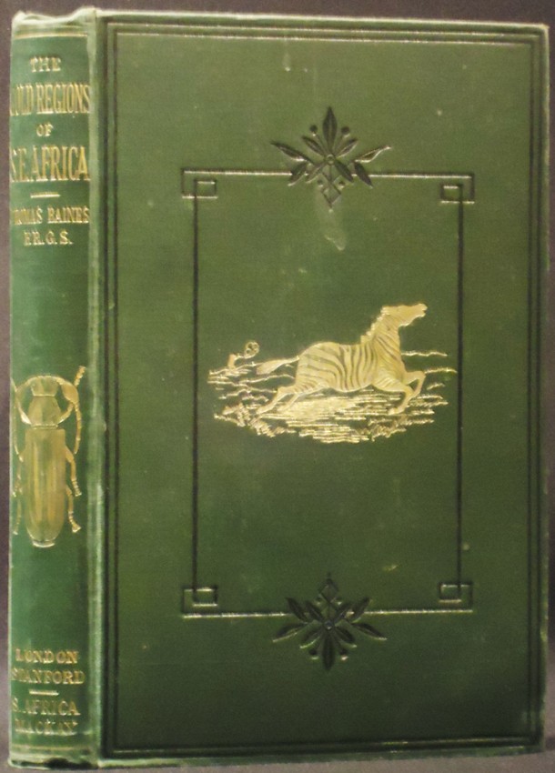 240 pages (including 51 pages advertisements), frontispiece portrait - a laid down photograph of Baines, title page vignette, large folding map in pocket in back cover, 3 plates, folding facsimile letter, engraved illustrations in the text, original pictorial dark green cloth with a gilt vignette of a galloping zebra on the upper cover, tiled gilt on the spine, working loose at the front hinge, but holding on to the netting, slight foxing on the page edges, a very good copy.