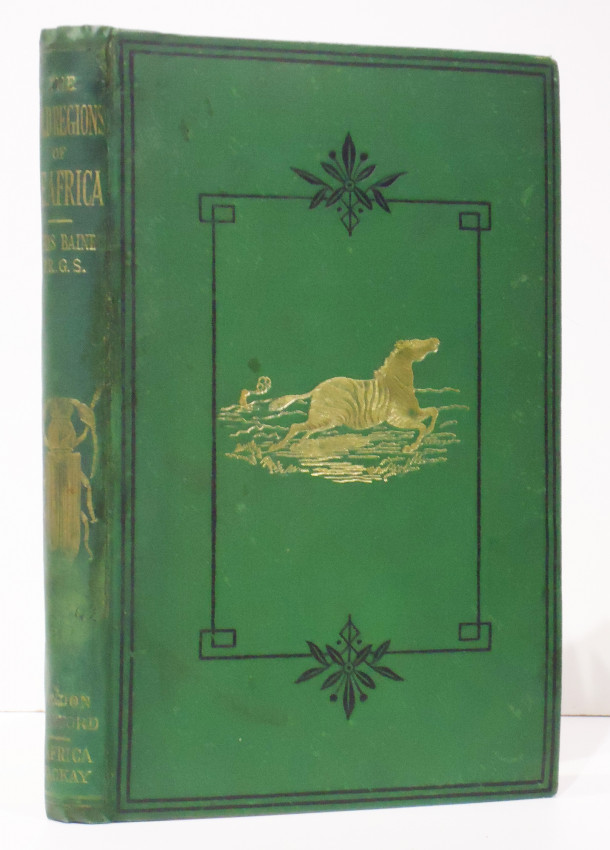 First edition: 240 pages (including 51 pages advertisements), frontispiece portrait - a laid down photograph of Baines, title page vignette, ownership stamp half removed on the verso of the title page, large folding map in pocket in back cover, 3 plates, folding facsimile letter, engraved illustrations in the text, original pictorial dark green cloth with a gilt vignette of a galloping zebra on the upper cover, tiled gilt on the spine, slight foxing on the page edges, a very good copy.