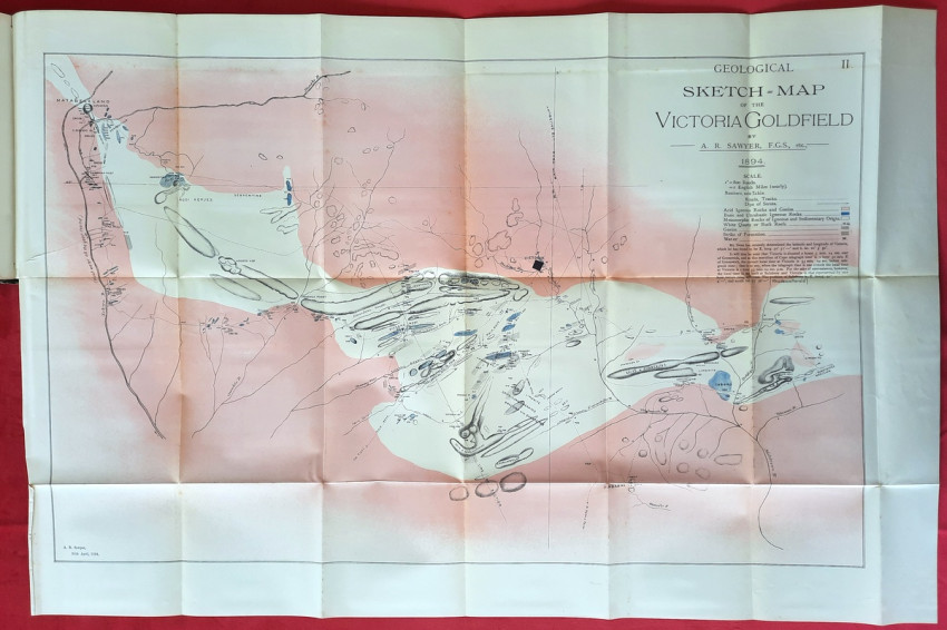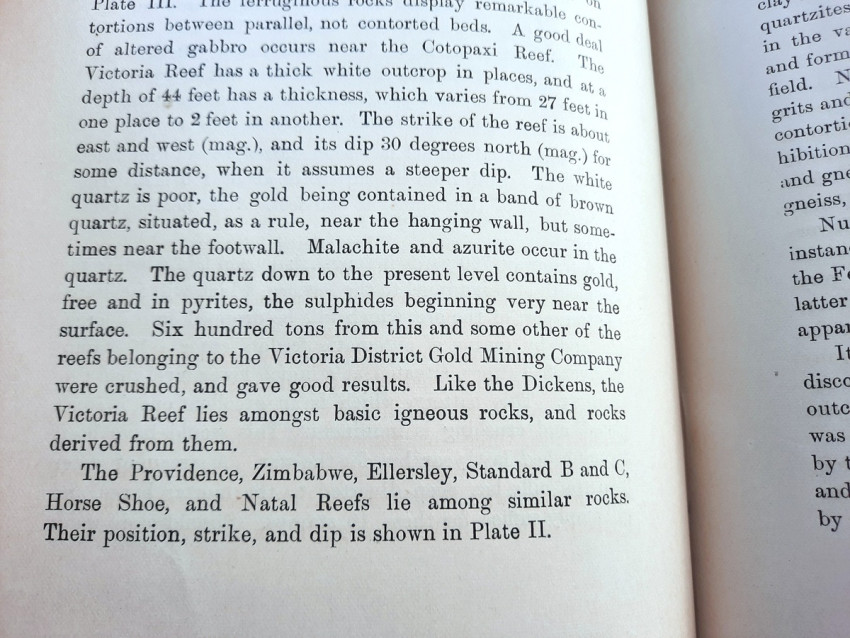 Contains the General sketch Map of Mashonaland showing Position of Goldfields, large Geological sketch Map of the Victoria Goldfield (80 x 54 cm) and large Geological sketch Map of Part of the Manica or Umfuli Goldfield (100 x 44 cm). Including multiple folding plans and sections of Victoria Goldfield, Beatrice Reef, Duchess Reef (Concession Hill District), Sabian Reef, Salisbury Reef, Gladstone Reef, Golden Frog Reef, Golden Frog Reef, Mashona Furnace, and Gipsy Extension East Reefs.