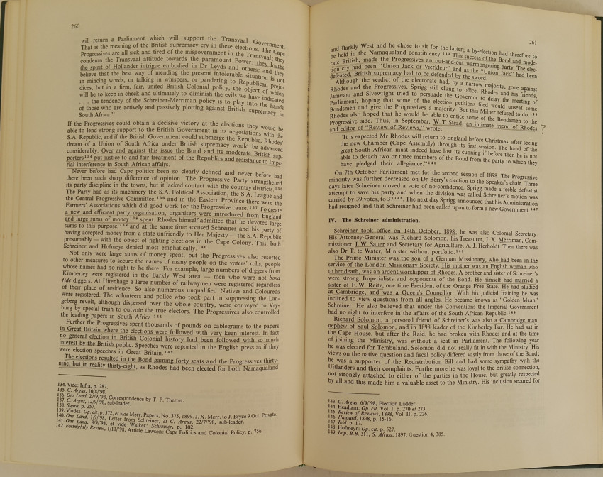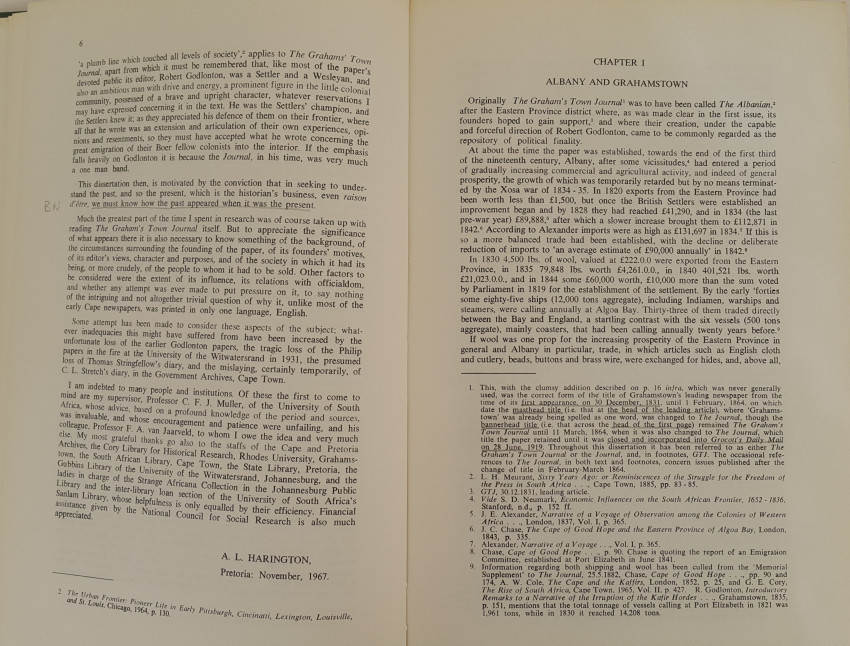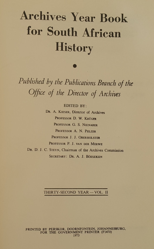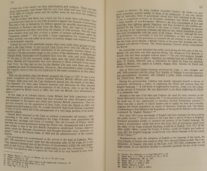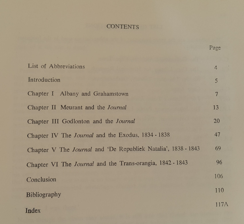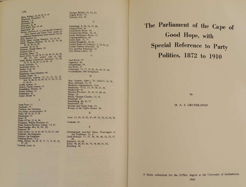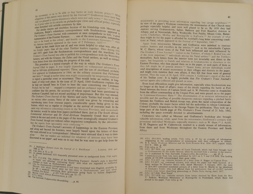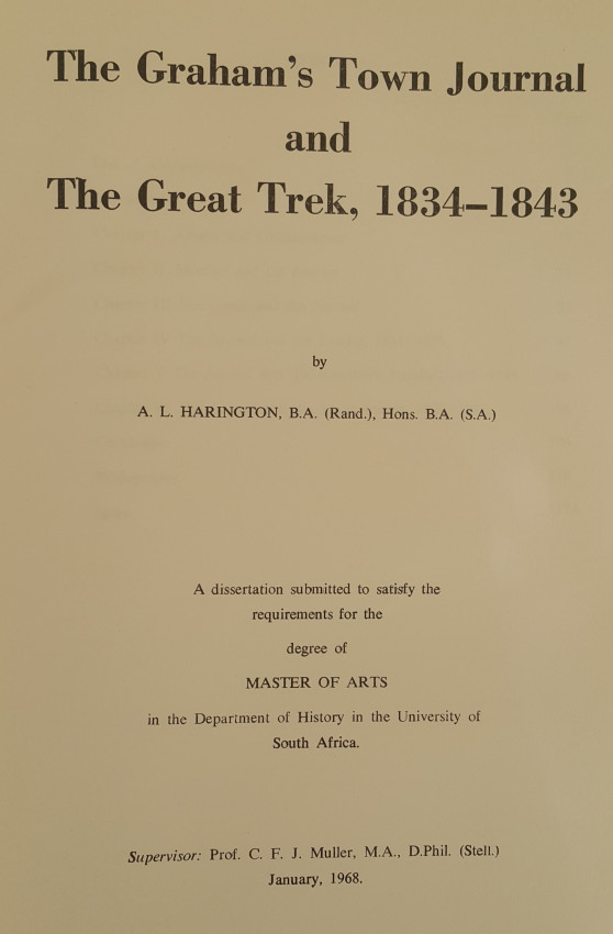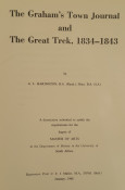 "The Graham's Town Journal and The Great Trek, 1834 - 1843" is a splendid account crammed with fine detail in the many foot notes. The thesis on the Cape Parliament unfortunately is heavily underlined in pencil. The volume is otherwise in very good condition. These archive journals are mines of detailed information on the subjects described. 349 Pages.