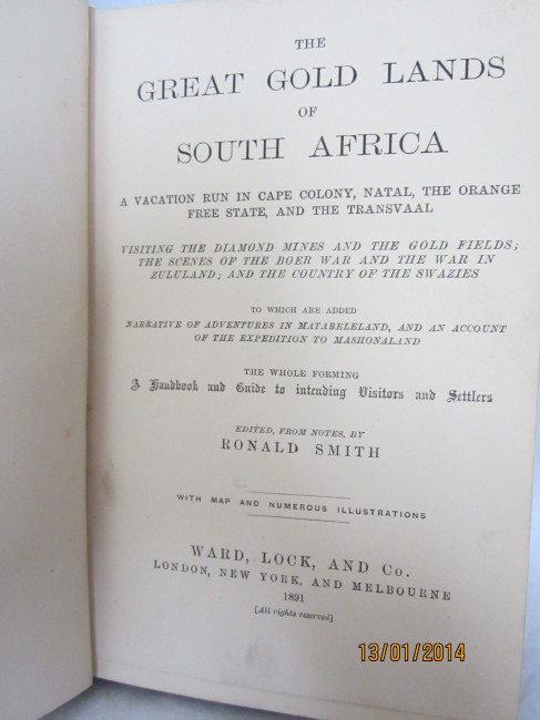296pages + 18 pages of publisher's catalogue, drawings, photographs, N.B. the map mentioned on the front cover was never bound in to this copy : a handbook & guide for intending visitors & settlers based on a tour of Cape Colony, Natal, Orange Free State & the Transvaal to which is added a narrative of adventures in Matabeleland & the Expedition to Masonaland; Mendelssohn II.332; bright illustrated front board & spine (see photograph), page edges sl browned, a VERY GOOD copy but please NOTE - the map is not present & was never bound-in to this copy