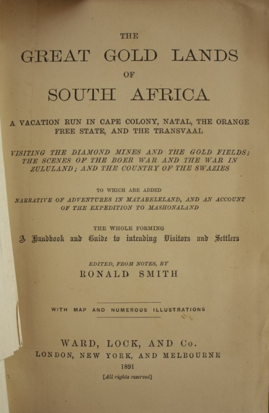 "The Great Gold Lands of South Africa. A vacation run in Cape Colony, Natal, the Orange Free State, and the Transvaal. Visiting the diamond mines and the goldfields; the scenes of the Boer War and the War in Zululand; and the country of the Swazies. To which are added narratives and adventures in Matabeleland, and an account of the expedition to Mashonaland. The whole forming a handbook and guide to intending visitors and settlers. Edited, from notes, by Ronald Smith."
