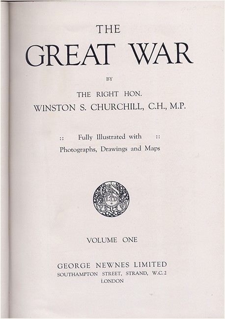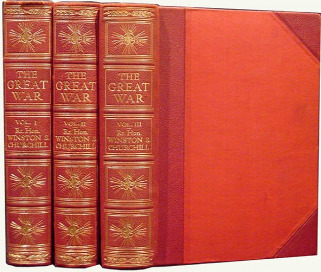 Cohen: Bibliography of the Writings of Sir Winston Churchill, Volume I, page 269ff., A69.9b, Three-volume, Newnes Issue, library binding 1934. \'Described by the publisher as "Half Crimson Morocco grained leather, cloth sides, the back lettered and panelled with decorative design in 22 carat gold. A striking, but dignified and durable binding." These cases were available at 4s. 6d. each. The charge for the cases, the binding and cost of carriage was 8s. each.\'