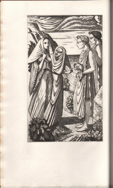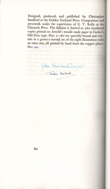 Designed, produced, and published by Christopher Sandford at the Golden Cockerel Press. Composition and presswork under the supervision of E.T. Kelly at the Chiswick Press. The Edition is limited to 360 numbered copies printed on Arnold’s mould-made paper in Caslon’s Old Face type. Nos. 1 – 60 are specially bound and contain in a gusset a second set of the eight illustrations with an extra one (in this copy one of the eight illustrations is not present but the extra plate is included), all printed by hand from copper plates.