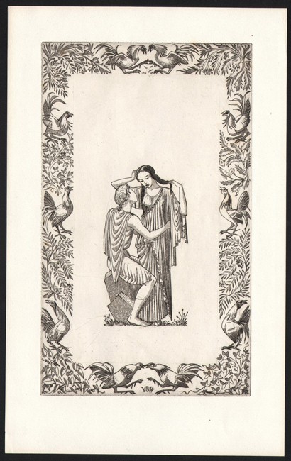 80 pages, 8 aquatint illustrations including the frontispiece, title page vignette (title printed in red and green) within a decorative border and 6 aquatint plates – all with loose tissue guards, full light blue and pink morocco with a gilt design of fighting cocks on the upper cover and gilt titling on the spine – bound by Sangorski & Sutcliffe, top edge gilt, other edges uncut, a second suite of the illustrations in a pocket in the back cover, contained in a green cloth slip case which is a little faded around the lip, a very good copy.