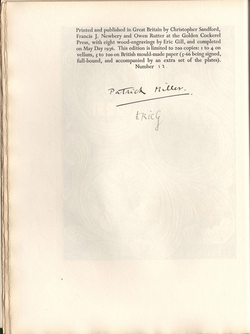 Printed and published in Great Britain by Christopher Sandford, Francis J. Newbury and Owen Rutter at the Golden Cockerel Press, with eight wood-engravings by Eric Gill, and completed on May Day 1936. This edition is limited to 200 copies: 1 to 4 on vellum, 5 to 200 on British mould-made paper (5 – 66 being signed, full-bound, and accompanied by an extra set of the plates).