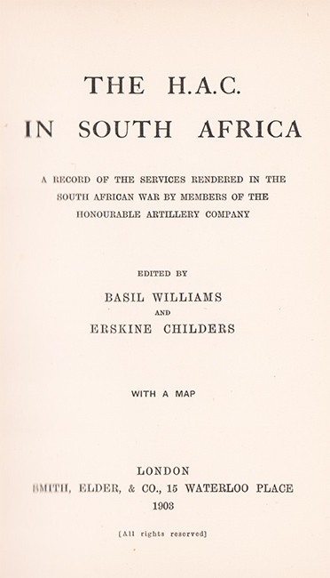 Hackett (R. G.) South African War Books page 12: A record of the 193 members if the Honourable Artillery Company who served in South Africa with the City Imperial Volunteers, the Imperial Yeomanry and various other corps. Of the H.A.C. members incorporated in the C.I.V. most served in the Field Battery and various chapters relate to its formation and war service. The volume contains a list of all H.A.C. members in South Africa showing rank and branch of service.
