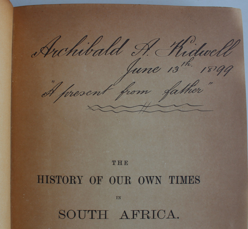 A gift inscription on title page of volume two reads: Archibald A. Kidwell, June 13th 1899. A present from father. Archibald Kidwell was a well-known Missionary (1876-1954) He was at time the Superintendent Minister of Primitive Methodism on the Rand and could speak Dutch / Afrikaans. Archibald Alexander Kidwell was born on 13 June 1876 at Jamestown, Albany District, Cape of Good Hope, South Africa. He was baptised on 2 December 1876 at Aliwal North, South Africa. His parents were Alexander James Kidwell, a general dealer, and Jane Willis Orchard. Archibald married Kate Hollidge (b1884) in late 1903 at Norwich, Norfolk.