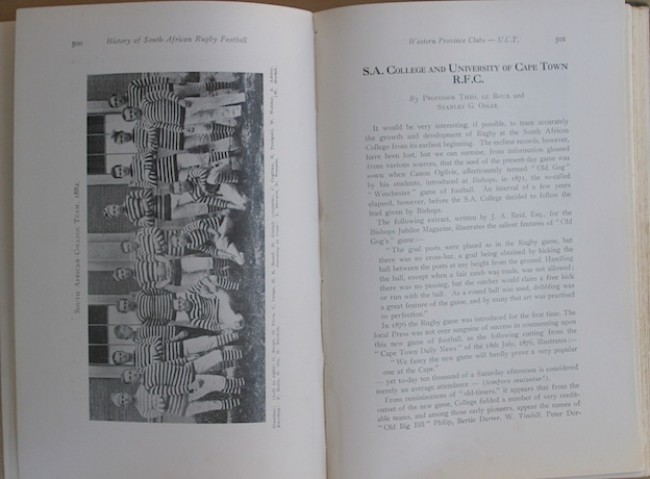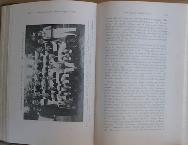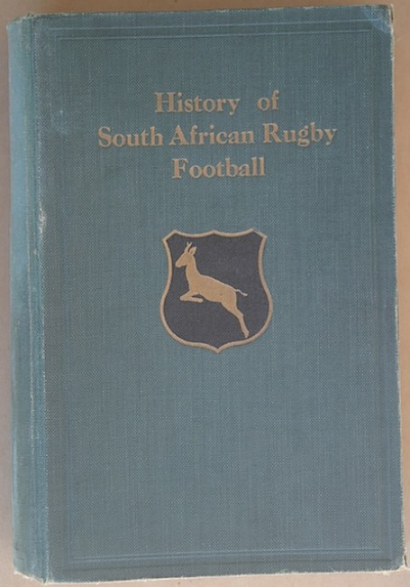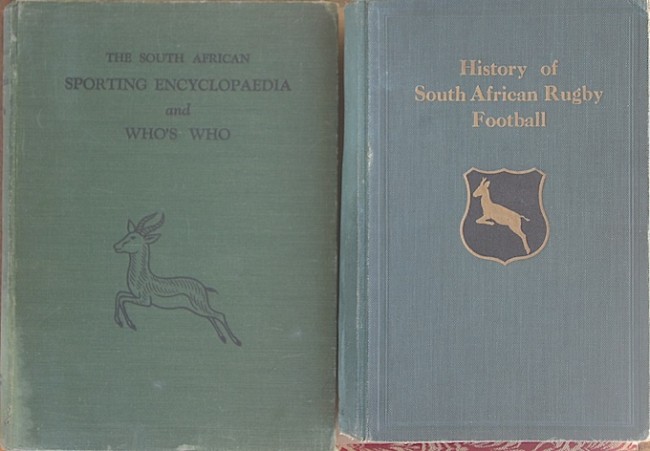 Lot of 2. (1) The History of South AFrican Rugby Football 1875-1932 by Difford, Ivor. The Specialty Press of S.A. Wynberg Cape 1933, green cloth with gilt to spine & front, Springbok emblem to front, xv + 736pp illus, 160mmx240mm, corners bumped, spine fading, internal seperation at hinges, inscription by previous owner on inside front cover, text clean and bright; plus (2) The South African Sporting Encyclopaedia and Who's Who. Hard Cover, Green Boards. First Edition. 190mm x 250mm. 464 pp. Black and white photographs. Shows shelf wear, boards are slightly rubbed and edges are bumped, hinges loosening, lower end of spine fading. Covering 38 sport codes, biographies of sportsmen and women, South Africa at the Olympic Games, Club Histories and a section on Rhodesian sport. A comprehensive source on South African sport up to 1950.