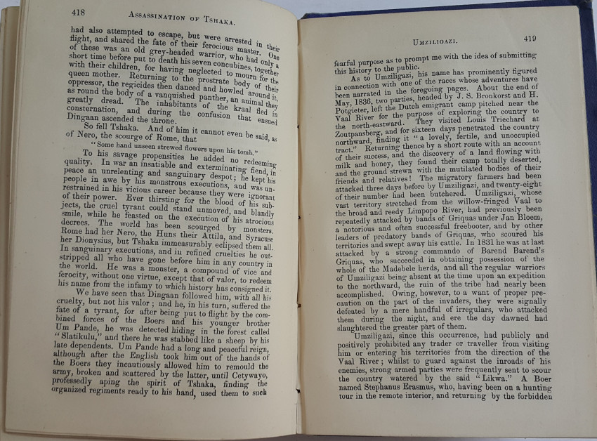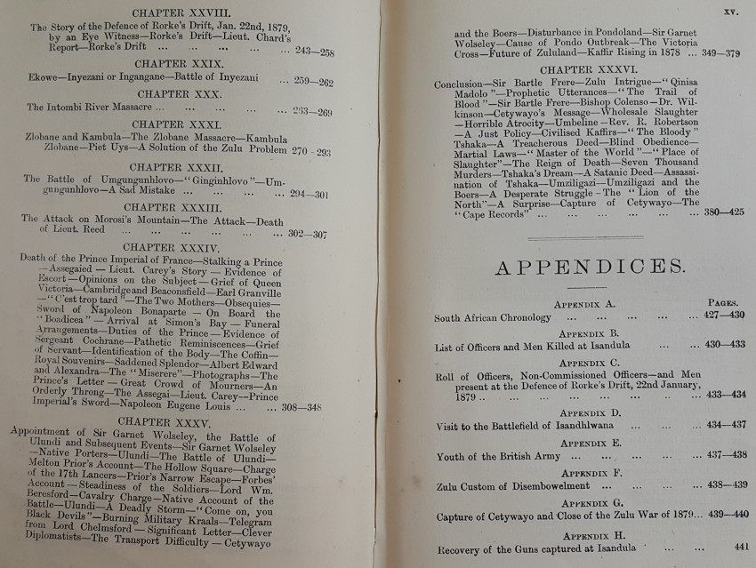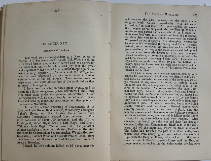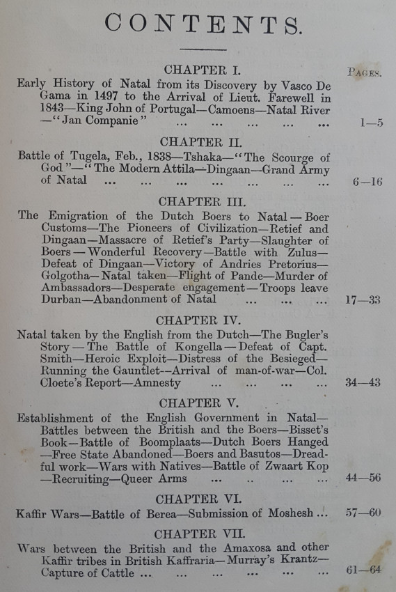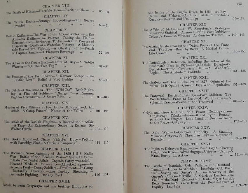 The author describes all the conflicts in South Africa from the Battle of "Blumberg", (Blouberg), to the end of the Zulu War. He spoke Zulu fluently and gives a detailed description of the Zulu War.