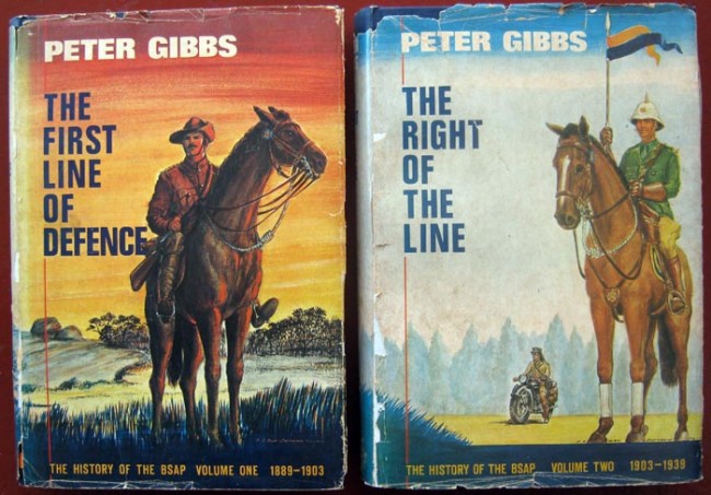Vol 1: The First Line of Defence 1889-1903. ix, 266p, b/w photographs. Dust jacket has been neatly repaired on inside on folds, is worn around the edges with slight paper loss to head of spine. Slight foxing. The first volume covers the occupation of Mashonaland, the first Matabele War, the Jameson Raid, and the relief of Mafeking. Vol 2: The Right of the Line, 1903-1939. xv, 244p, b/w photographs. Dust jacket also worn and repaired, has closed tears along edges and paper loss to head of spine. Covers the period of the First World war and German East Africa.