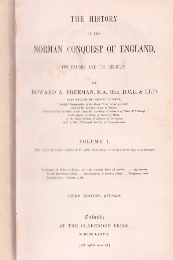 Edward Augustus Freeman (2 August 1823 – 16 March 1892) was an English historian, architectural artist, and Liberal politician during the late-19th-century leadership of Prime Minister William Gladstone, as well as a one-time candidate for Parliament. He held the position of Regius Professor of Modern History at Oxford. He was a prolific writer, publishing 239 distinct works. One of his best known is his magnum opus, The History of the Norman Conquest of England (published in 6 volumes, 1867–1879). https://en.wikipedia.org/wiki/Edward_Augustus_Freeman