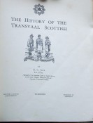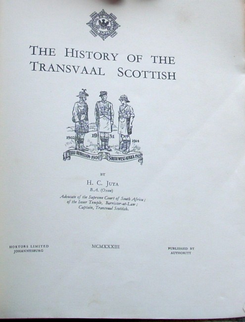 The History of The Transvaal Scottish, December 1902 to July 1932, with appendices on the South African Scottish and Scottish Horse, by Advocate Hubert Calla Juta, by authority, 1933, forward by the Duke of Atholl, card boards, photographic illustration, 4 fold-out maps, 152 pages, 190 x 250mm, card boards have extensive edgeware and are detached from the book, internally very good.