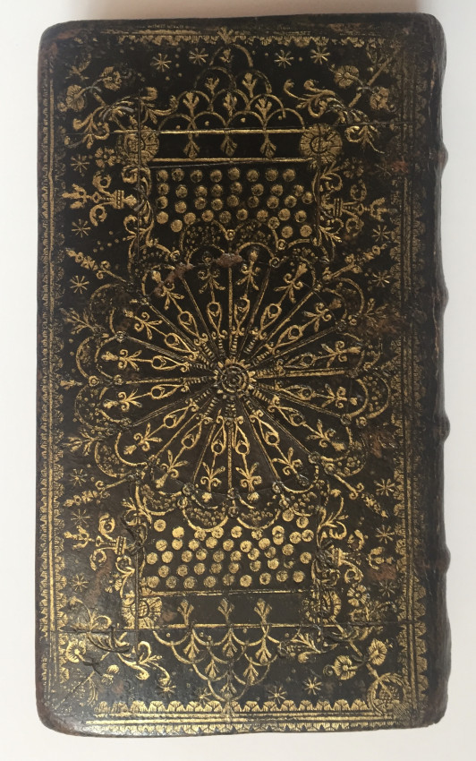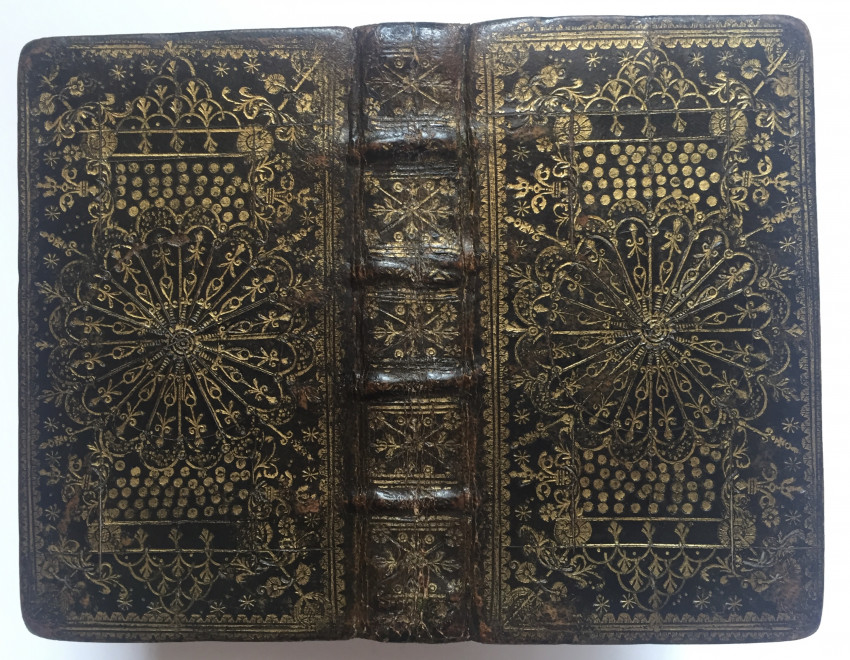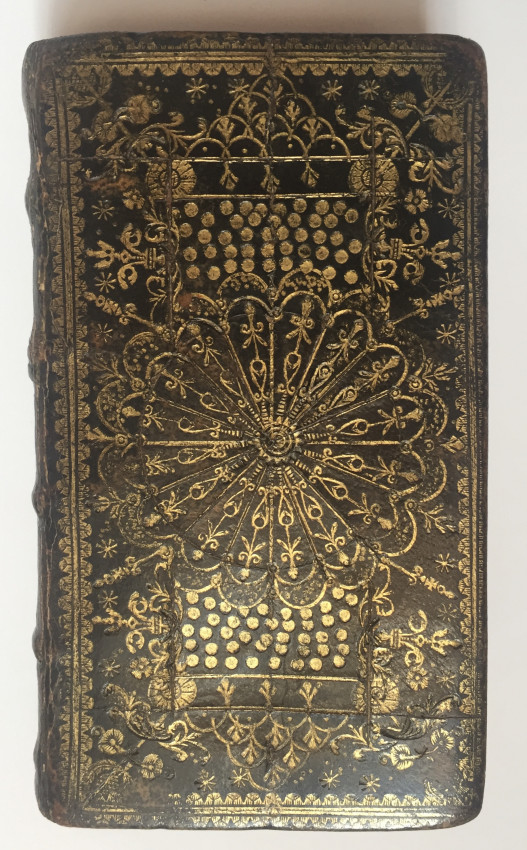 Fine 18th-century Scottish black morocco, covers design with elaborate all-over decoration in gilt, centering on a typical 'wheel' design surrounded by massed small tools and large dots, spine gilt in five compartments with raised bands, decorative 'Dutch' endpapers, gilt edges (neat archival reapair to the front pastedown [see images])