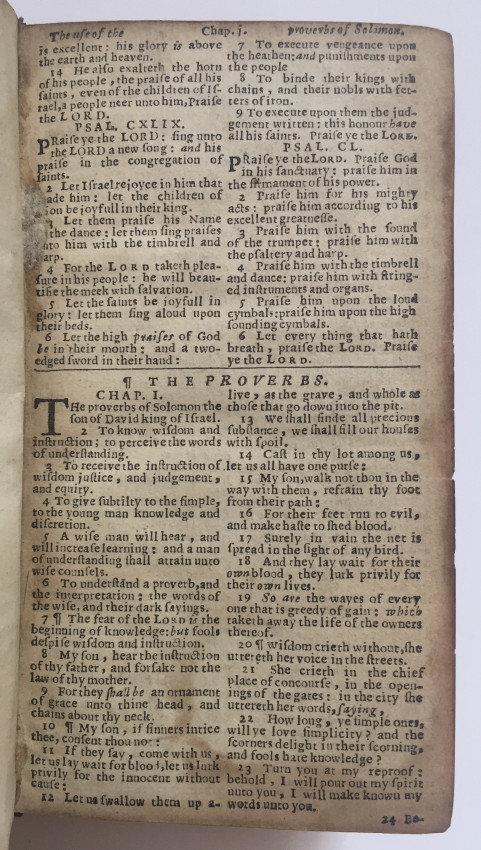 1 volume only (of 2, lacking the first volume), 24mo bound 12s (4 5/8 x 2 5/8in; 117 x 67mm). Collation: Bb8-12; Cc-Zz¹². The text starts with 'Proverbs' Chapter 1, verse 1, runs through to the end of the Old Testament, followed by separately dated letterpress title page on Nn6r for "The New Testament..." and the whole of the text of the N.T. (Text-block trimmed close, occasionally just touching the text).