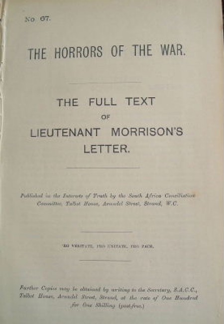 Full title: "The horrors of the war. The full text of Lieutenant Morrison's letter. Published in the interests of truth by the South Africa Conciliation Committee ...." Pamphlet, without covers, as issued. Pp. 16. Text of a letter written by a Canadian artilleryman about the treatment of Boer women by British forces and of farm burning in the eastern Transvaal. South Africa Conciliation Committee, pamphlet no. 67. SABIB, 4/290. Disbound, inner hinge damaged