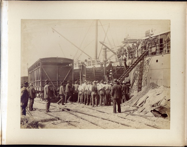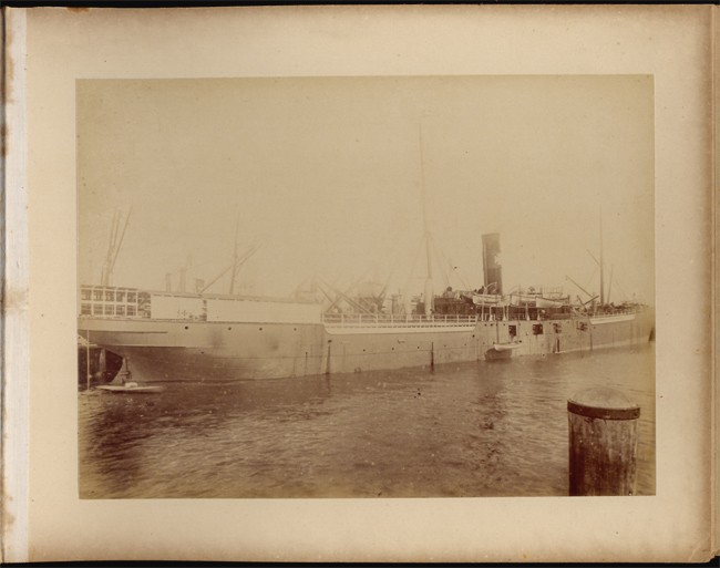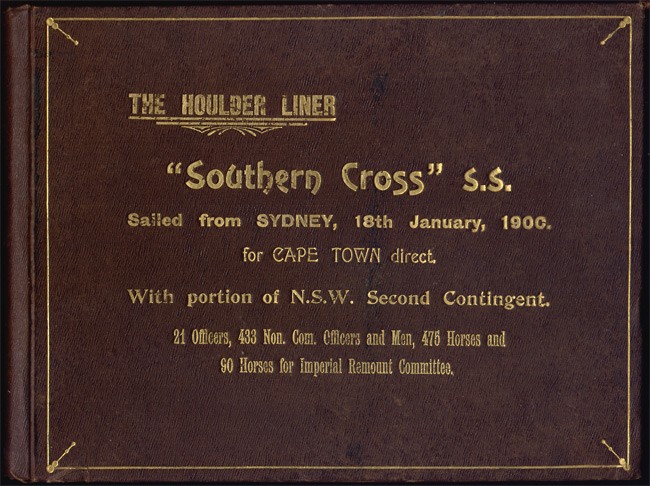 11 full plate photographs, mounted on stiff card, brown cloth titled in gilt on upper cover. The photographs are of the ship and the loading of the horses of the Second Contingent bound for South Africa.