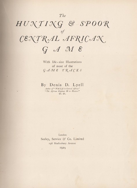 Czech (Dr. K.) An Annotated Bibliography of Big Game Hunting Books 1785-1999, (2011), page 174: 'Lyell provides rules for hunting big game, as well as chapters dealing with rifle selection and tracking game. The remainder of the text examines the natural history traits, and methods of hunting, species by species. The illustrations consist of sketches of the spoor of game animals, many being life-sized. An essential work aimed at a generation of new hunters visiting Africa at the time'.