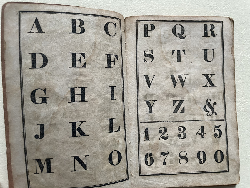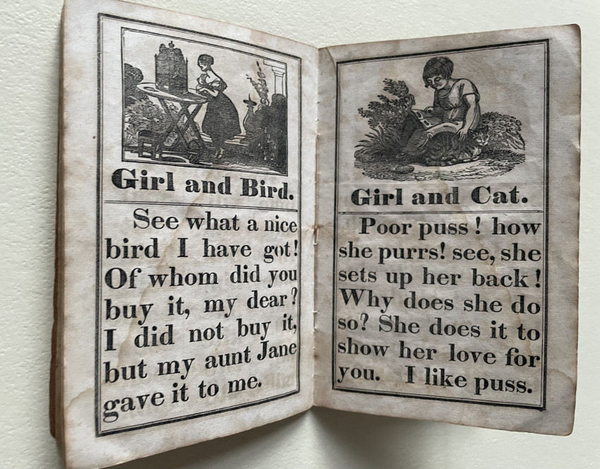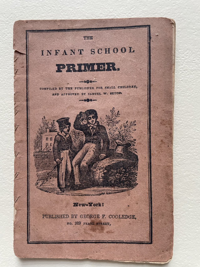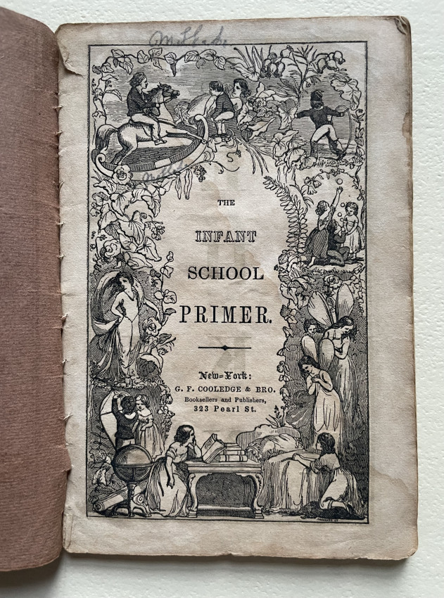 The infant school primer, G.F. Cooledge & Bro., Booksellers and Publishers, 323 Pearl St., New-York, 32 unnumbered pages, 4x6 inches, original pink wraps