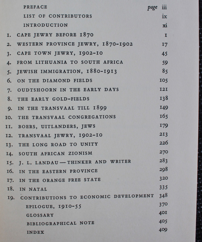 There are chapters that deal with Jewish communities in particular localities, and others that deal with more general topics such as the Zionist Movement, the immigration of Lithuanian Jews, and the relations between Jews, Boers, and Uitlanders before the South African war. An epilogue covers the period from 1910 to 1955.