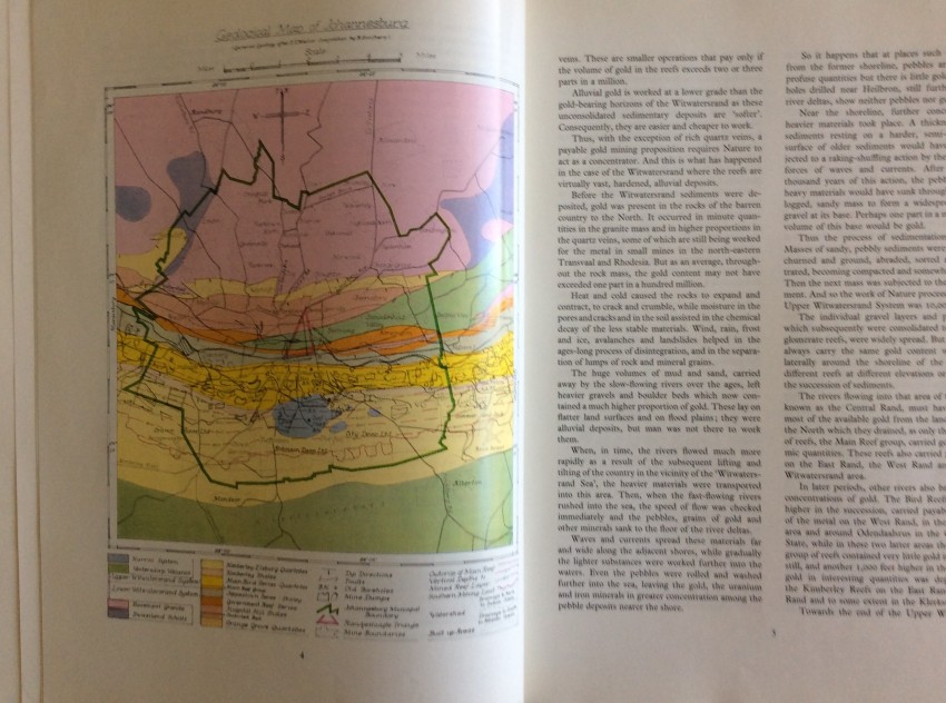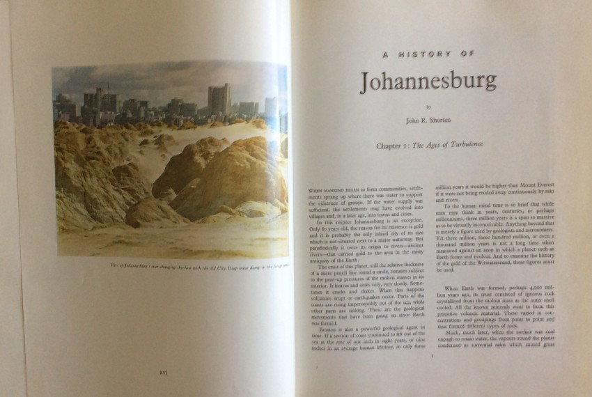 From the preface: "Since Johannesburg is the 'City of Gold', I have outlined the history of Earth with particular reference to the Witwatersrand and the formation of its famous gold reefs; recorded, in as much detail as possible in a work of this kind, the history of gold-mining and of gold metallurgy; and traced the important and often decisive part played by the metal in the affairs of men and nations from the time of Menes to our day . . . " The author's coverage of the above subjects represents no more than about 10% of the book's total contents; the remaining 90% covers some 22 municipal departments and some 67 of the more prominent public companies.