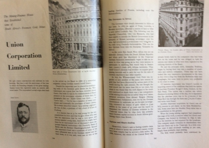 [The images selected include part of the entry on Union Corporation, on one of whose mines the seller trained underground, and two of the four references in the book to Philippolis, where the seller has his bookshop.]
