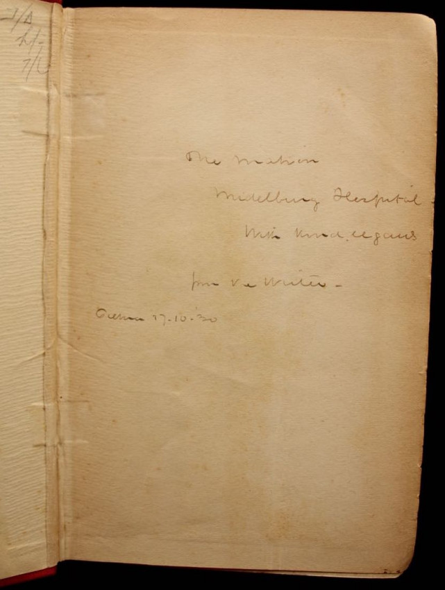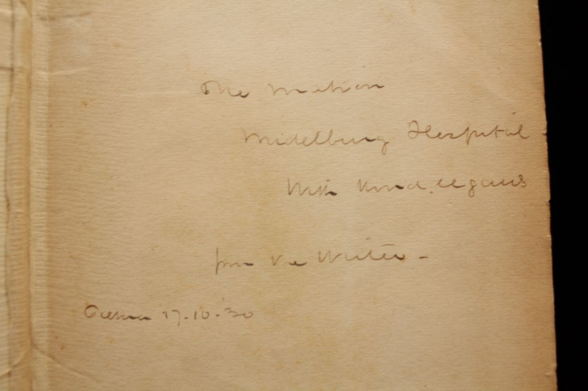 Inscribed by the author on the front endpaper, "The Matron, Middelburg Hospital, with kind regards, from the writer, Pretoria 17-10-'30".