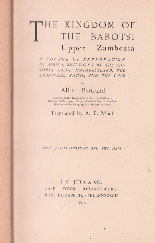 Czech (Kenneth) Bibliography of African Big Game Hunting Books 1785 -1999, page25: Bertrand, a Swiss army officer joined an expedition headed by Captain A. St. Hill Gibbons, to the interior of Barotseland. There are detailed accounts of the journey taken from the author's diary, with special attention paid to the terrain and natives of the region. Nearing the rivers Machila and Zambesi, the author bagged buffalo, wildebeest and lion. The illustrations by Van Muyden are particularly vivid.