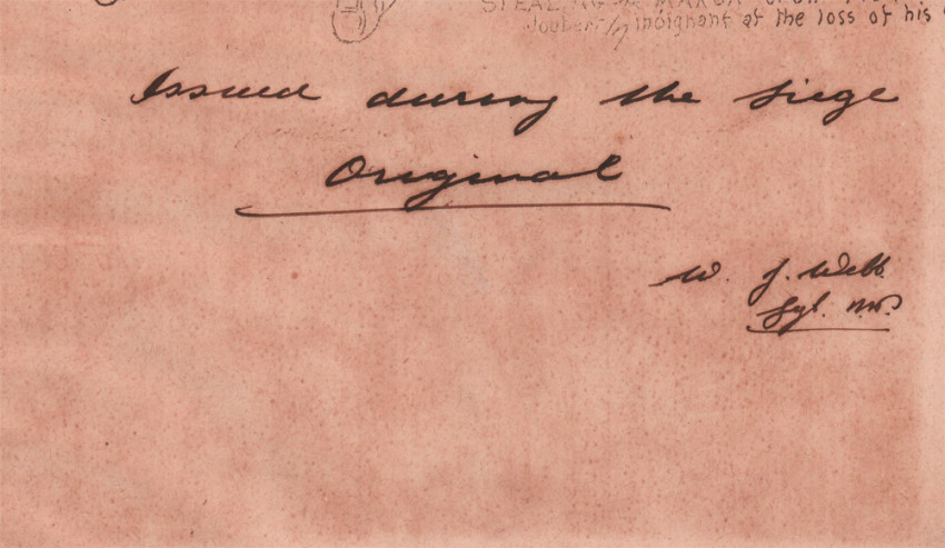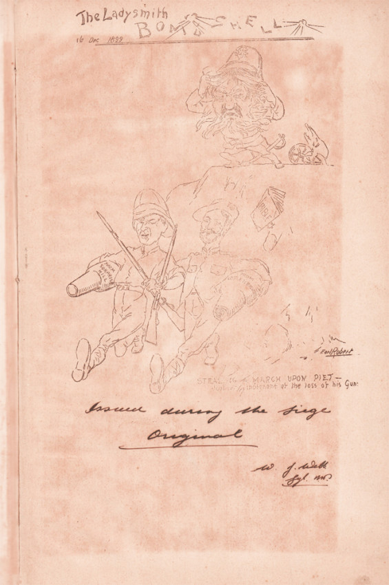 Under the cartoon is a handwritten note : Issued during the Siege – original - signed by W. J. Webb Sgt.N.P.