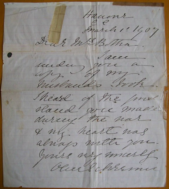Sold with a letter to Mrs. Botha from Olive Schreiner and a photograph (see images) The photograph was taken at the Vaal River, Parys. The image is small and the people pictured are difficult to identify with certainty. The book itself is inscribed to Mrs. Botha from Olive Schreiner.