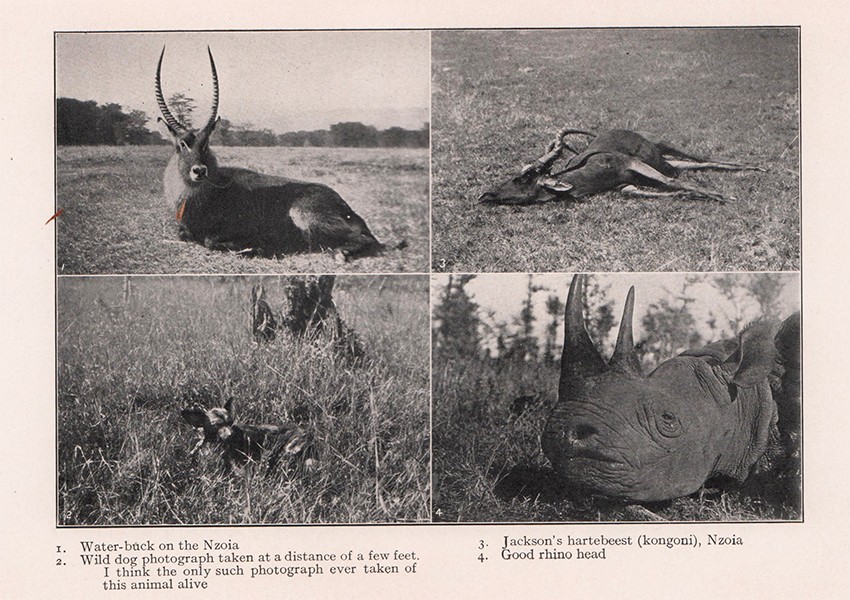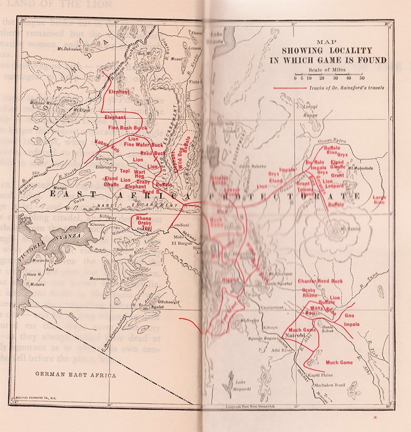 Czech (Dr. Kenneth) An Annotated Bibliography of African Big Game Hunting Books 1785 – 1999, page 229 -230: Rainsford's 'sefari' trekked through British East Africa where a variety of game was bagged. After crossing the Mau Escarpment, the author's party hunted lion, buffalo and rhino, then elephant near Mt Elgon. Later, rhino and buffalo were taken near the Guaso Nyiro. He remarked that shooting elephant with a .500 or .577 were outmoded - a .256 Mannlicher or .275 Mauser would do perfectly well. There are plenty of big game hunting adventures throughout.