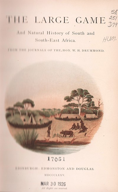 Czech (Kenneth)AN ANNOTATED BIBILIOGRAPHY OF AFRICAN BIG GAME HUNTING BOOKS revised edition 2011, pages 85 -86 'While the title suggests that this is more of a scientific title, most of the text revolves around Drummond's sporting adventures from 1868 to 1872. There are long chapters describing his hunting experiences after buffalo, eland, lion, elephant, rhinoceros, and leopard with attendant narrative on various antelope and on hunting with dogs. Though he bagged a number of elephant, he was concerned that continued hunting would extirpate the animal "merely for the purpose of supplying Europe with ivory ornaments and billiard-balls...." This work is written in a lively style with unique illustrations'.