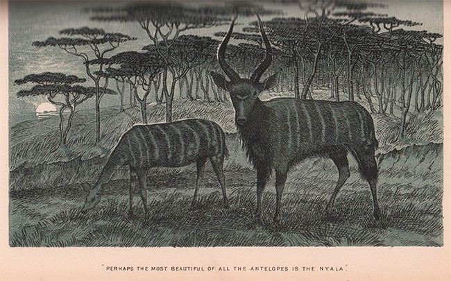 428 pages, coloured map, half title page with sub-title ROUGH NOTES ON THE LARGE GAME, chromolithographic frontispiece and title page vignette, library ownership mark embossed on title page, 12 tinted plates, many wood engraved illustrations, attractive recent full green morocco, raised bands with blind tooling and titled gilt on spine, the plate entitled “perhaps the most beautiful of all the antelopes is the nyala” is bound in opposite page 372, not page 378 as indicated in the list of illustrations, some occasional foxing in the text, top edge gilt, a very good copy.