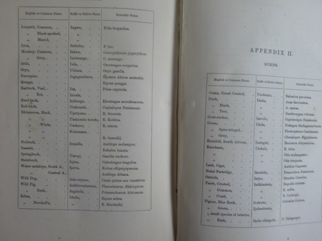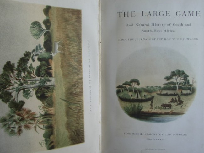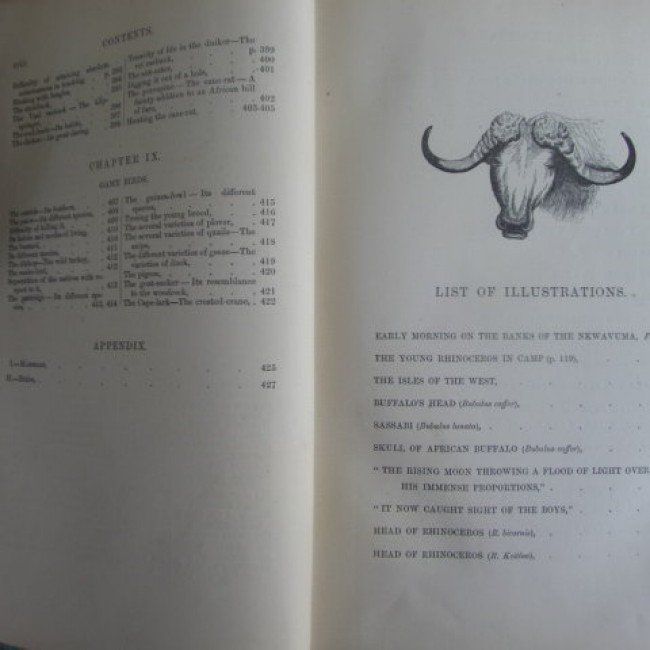 Drummond's approach to travel and hunting differs from those of his predecessors and contemporaries in the contents of his chapters. Instead of these being, for example, a consecutive tale of his travels, he allocates them to Buffaloes, Rhinoceros, Eland, Elephant, Lions, Leopards, Hunting with Dogs, Anecdotes of Antelopes, and Game Birds. It is a successful arrangement, which he ends with appendixes that give English, native and scientific names for Mammals and Birds.