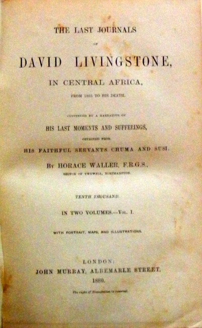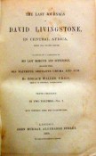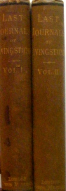 THE LAST JOURNALS OF DAVID LIVINGSTONE IN CENTRAL AFRICA. From 1865 To His Death. Continued By A Narrative Of His Last Moments And Sufferings, Obtained From His Faithful Servants Chuma And Susi. In Two Volumes. With Portrait, Maps And Illustrations, presumed first edition, tenth thousand,volume one with 7 full page engravings and 18 illustrations, 360 pages, 2 maps with general map of livingstone's own discoveries in card sleeve on back board, volume 2, 15 full page engravings, 6 illustrations, 346 pages, publishers advertisement at end, map in volume two seems to have been fixed in volume one, slight foxing, one line inscription on first blank page in each volume, condition:good to very good