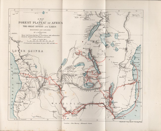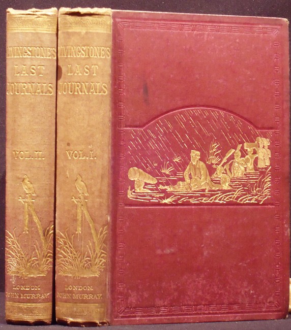 2 volumes, 360+346 pages, frontispiece portrait of Livingstone in volume 1, engraved frontispiece in volume 2, large colour folding map in pocket in back cover of vol. 1, 1 other colour folding map, 19 plates, 24 illustrations in the text, original maroon cloth with gilt vignettes on the upper covers and gilt titling and decoration on the spines – the spine are slightly faded, edges uncut, contents crisp, bookplate on each front paste-down endpaper, an unusually good set.
