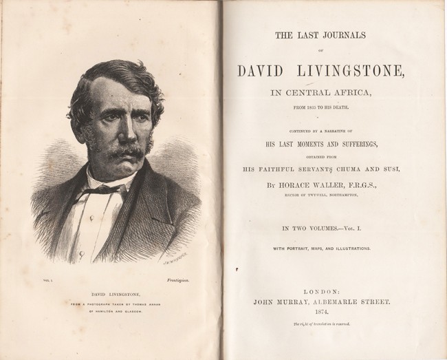 Mendelssohn (Sydney) South African Bibliography, volume 1, pages 912/13, 'These journals include "a series of travels and scientific geographical records of the most extraordinary character....of seven years' continuous work and new discovery," in the course of which “no break whatever occurs….from the time of Livingstone’s departure from Zanzibar in the beginning of 1866 to the day when his note-book dropped from his hand in the village of Ilala at the end of April 1873.” ….The last explorations were conducted in the vicinity of Lake Bangwelo, where, thoroughly broken down and worn out, the greatest traveller of modern times died on May 1, 1873, at Chitambo. His faithful servants, Susi, Chuma and Jacob Wainwright, preserved his body and papers, and brought them safely back to England, where his remains were interred in Westminster Abbey, on April 18, 1874.’