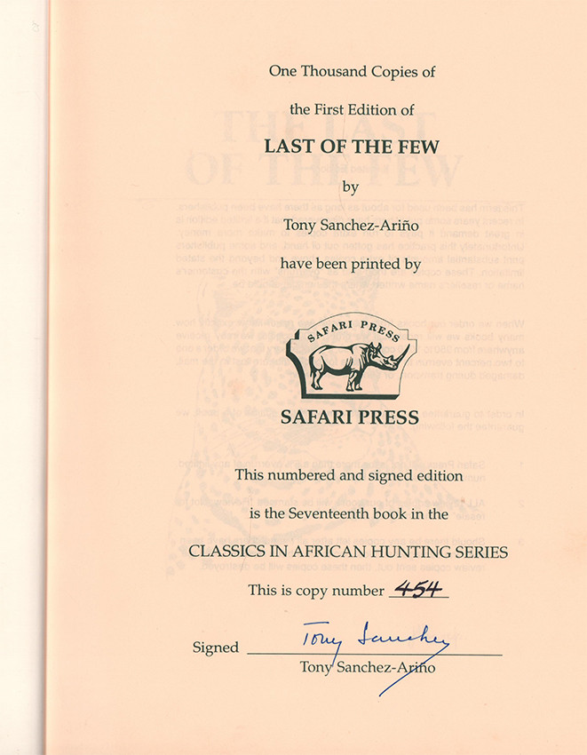 The limitations page reads: One thousand copies of the first edition have been printed. This numbered and signed edition is the seventeenth book in the Classics in African Hunting Series. This is copy number 454 signed by the author.