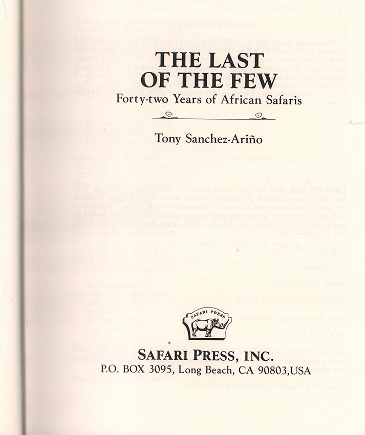 Czech (Kenneth) An Annotated Bibliography of African Big Game Hunting Books 1785 -1999, page 243: The author recounts over forty years of hunting experiences starting in 1952 in West Africa and continuing in the Sudan, Kenya, Central African Republic, Botswana, Zambia and other locales. His bag included the Big Five and a host of spiral horn antelopes. He also discusses rifle and caliber selection