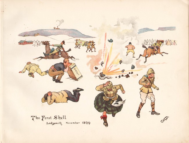 18 humorous chromolithographic coloured sketches with captions on opposite leaves, original white pictorial paper covered boards slightly stained, green cloth spine.