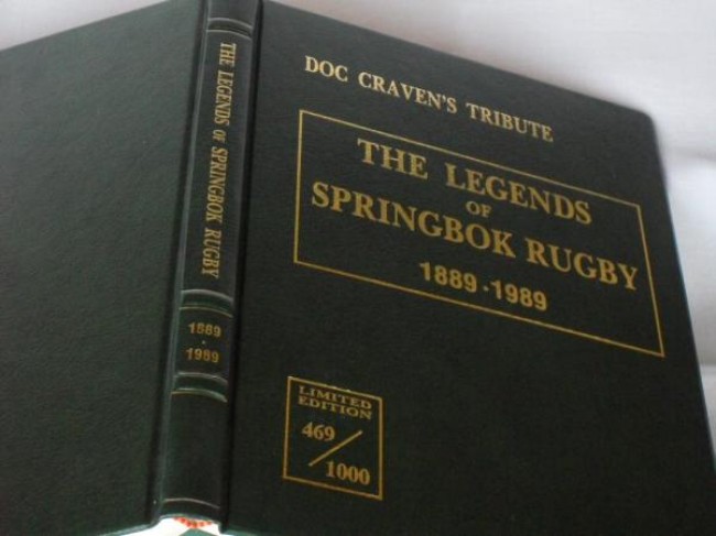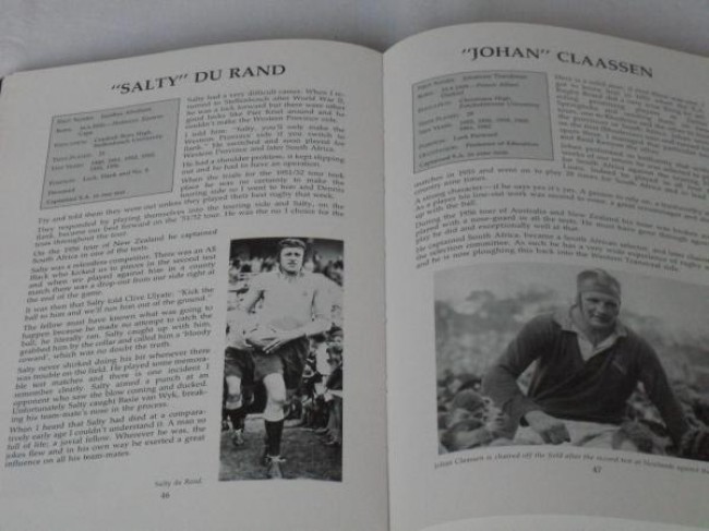 The green Skivertex board coves, gilt to front and spine, have rounded corners (one with a very small rubbed spot). The quality binding befits the limited edition: thread-sewn sections, rounded back, head and tail bands and five raised spine bands. The printed endpapers show two unidentified grainy action close-ups. and includes some 140 autographs and illustrated biographies of the same number of players, captains separately, arranged alphabetically and followed by a portfolio of colour photographs of some 50 Springboks at home or outdoors in the late 1980s. The selection was made from the more than 550 rugby Springboks who represented their country over the 100-year period.