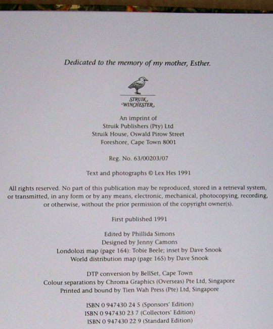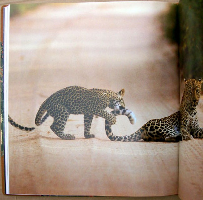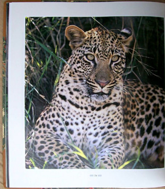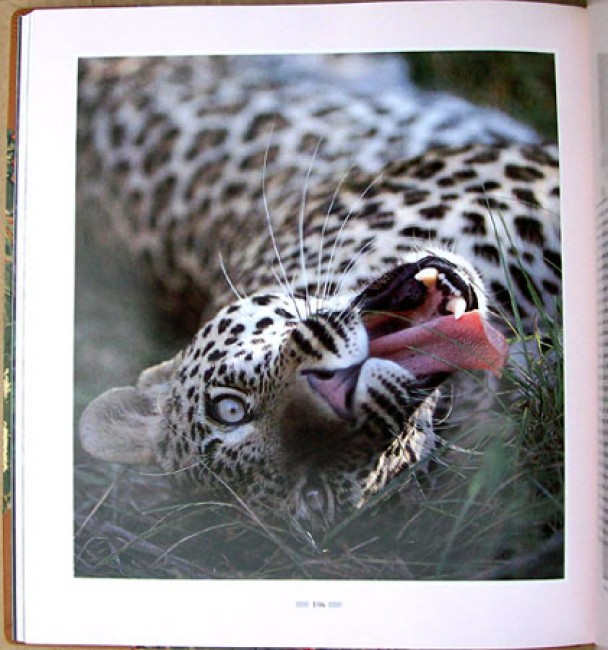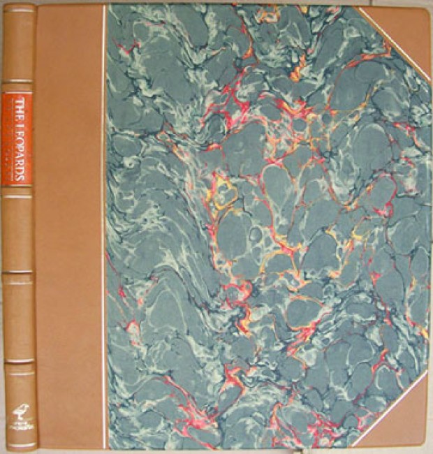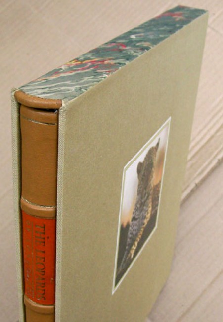 Housed in the original slipcase covered with book cloth, marbled paper and leather trim with a colour photograph inset on the upper side. The light brown goatskin leather and marbled paper binding has a red title label on the spine. Textured end papers. 172 pages and illustrated with over 130 exceptional colour photographs of leopards in their wild habitat.