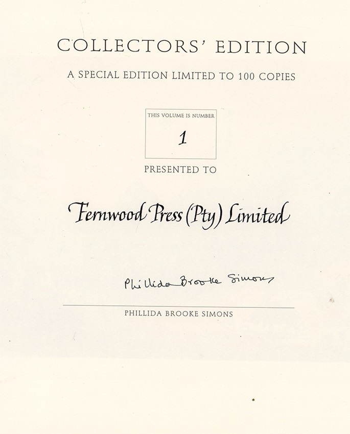 The limitations page reads: Collectors' Edition. A special edition limited to 100 copies. This volume 1 is presented to Fernwood Press (Pty) Ltd signed by the author.