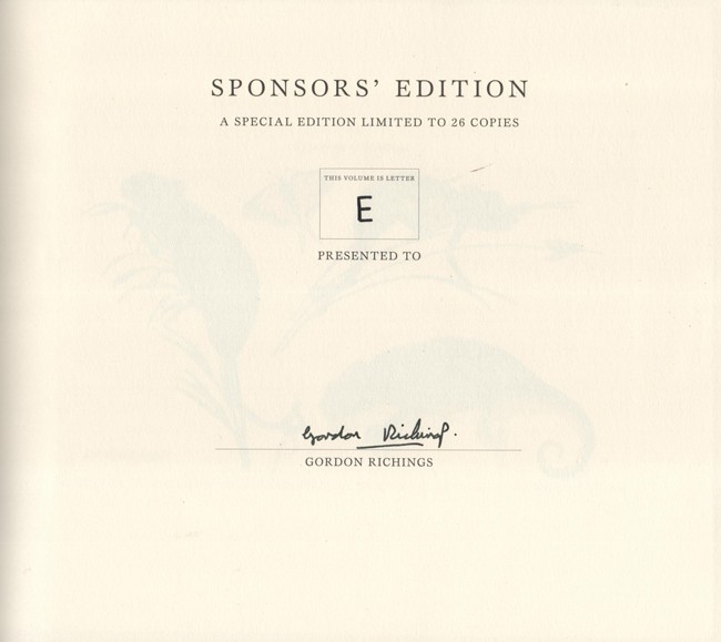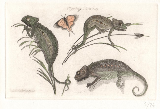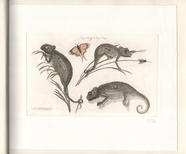 The Sponsors’ Edition is limited to 26 copies signed by Gordon Richings. Tipped in is a hand-wiped and hand-coloured etching by Charles Michell, Chameleons at the Cape of Good Hope, printed from the original copper plate, numbered 5/26.