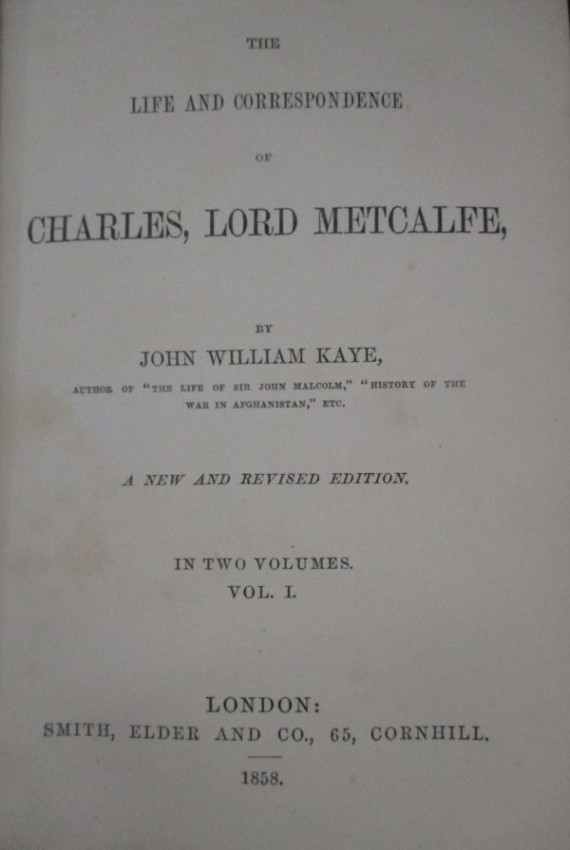 Lord Metcalfe (1875-1846) was a Governor-General of India , Governor of Jamaica and Governor-General of Canada. The two volumes consist of previously unpublished letters and journals to his friends and family.
