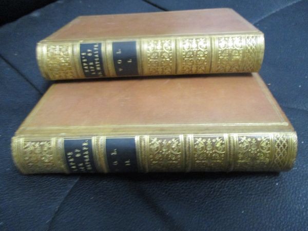 Tan leather with gilt decoration and gilt titles. Vol 1 & 2. Very good overall condition some foxing on end papers and vol 1 has name of previous owner on front end paper.